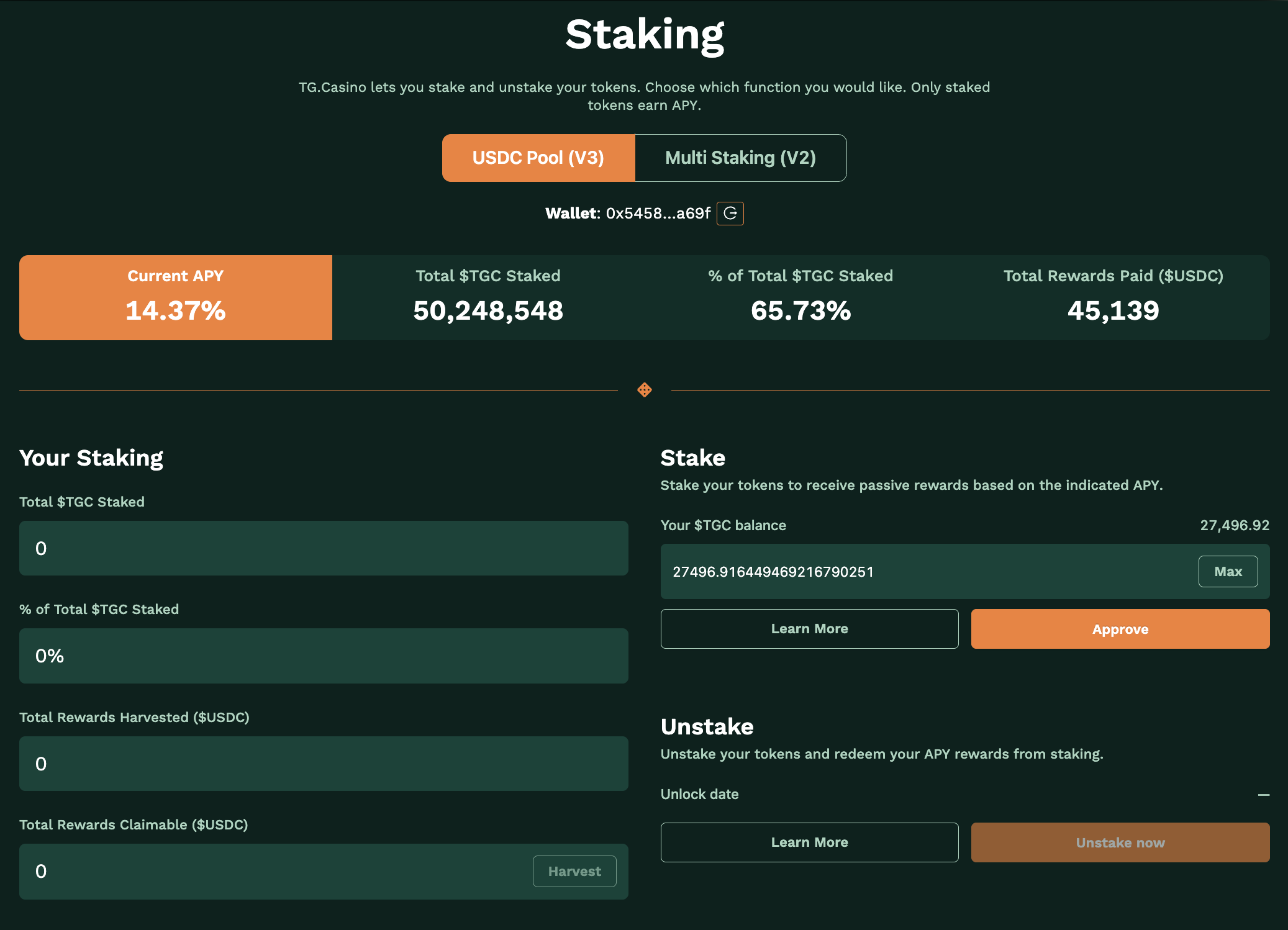 Staking involves locking up a certain amount of $TGC within the platform for a predetermined period. In return, stakers receive rewards in the form of USDC and if over 5000 tokens are staked then the staker automatically qualifies for a share of the casino profits, essentially earning interest on their staked amount.